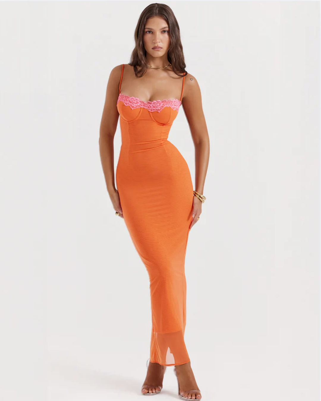 Unveil your bold side with the Delilah Lace Detail Dress — a captivating bodycon gown crafted to highlight your shape with precision. The lace detailing adds dimension and texture, while the streamlined cut carves out a look that's daring yet refined. Perfect for events where standing out is the only option.